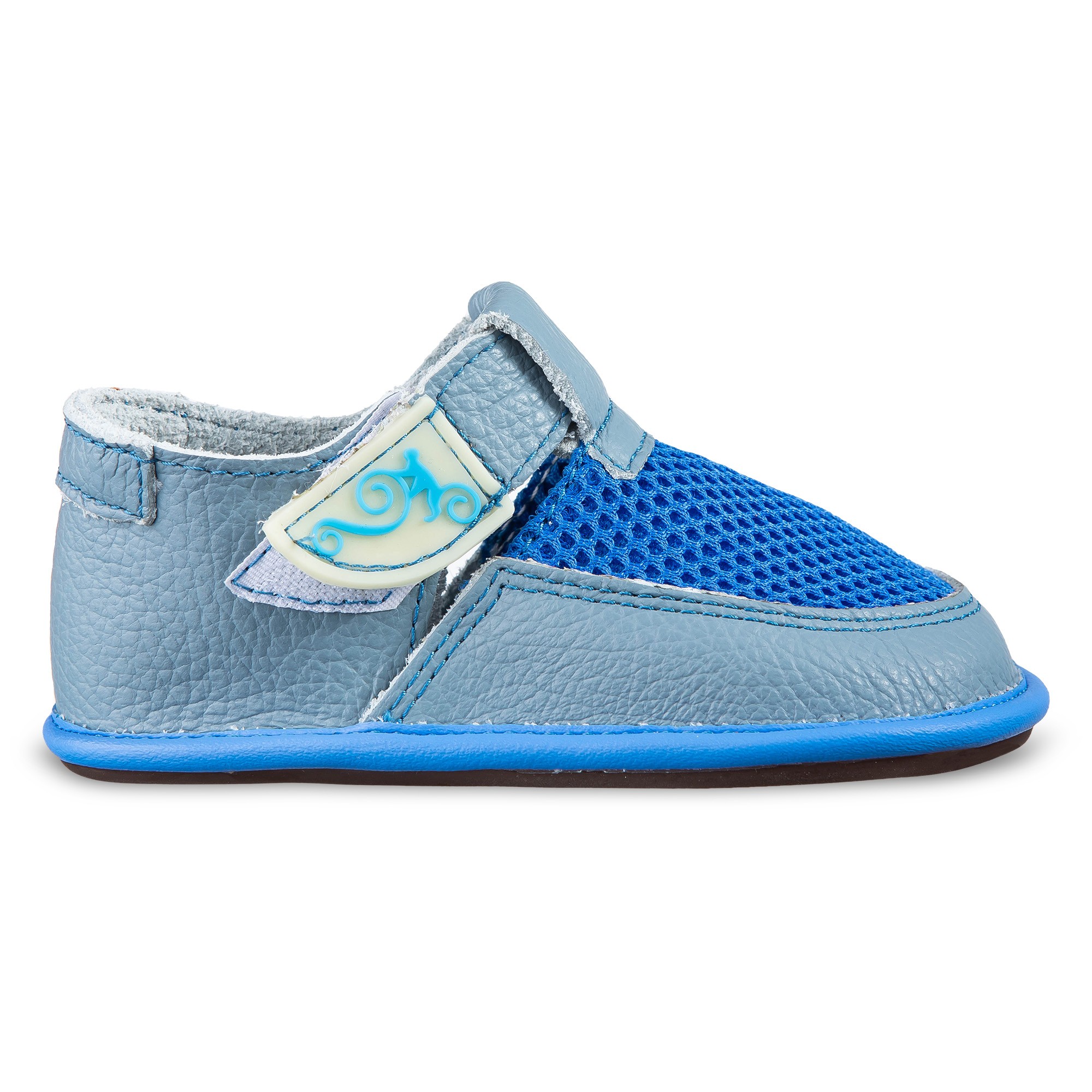 Cholewka oraz wyściółka wykonane są z naturalnej skóry, co wpływa na trwałość, elastyczność i odpowiednią cyrkulację powietrza. Cienka, elastyczna i płaska podeszwa umożliwia dobre czucie podłoża i naturalną pracę stóp dziecka, jednocześnie zapewniając podstawową ochronę przed otarciami. Dzięki zastosowanemu zapięciu na rzep, but można łatwo dopasować do stopy. Szeroki przód nie ogranicza paluszków, a płaska podeszwa bez podniesionej pięty wspiera naturalne ustawienie ciała.