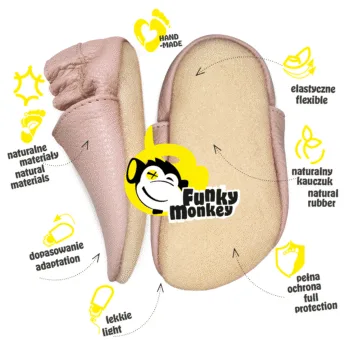 Funky-Monkey Slippers to miękkie, elastyczne kapcie dziecięce stworzone z myślą o wygodzie, naturalnym rozwoju stóp i bezpiecznym użytkowaniu w domu, żłobku lub przedszkolu. Minimalistyczna konstrukcja barefoot daje dzieciom wrażenie chodzenia boso, wspierając rozwój równowagi, motoryki i prawidłowej postawy.